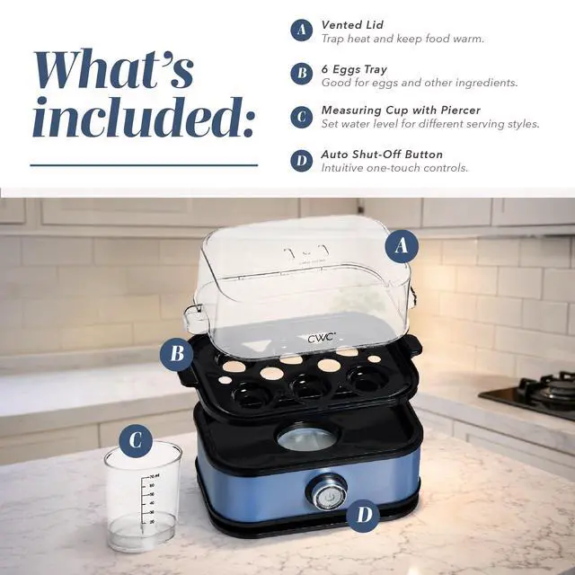 | Included Components | 6 Egg Tray, Measuring Cup, Vented Lid |