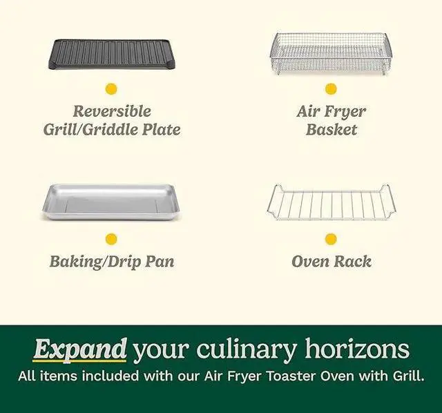 WHATS INCLUDED: The Cuisinart Air Fryer Toaster Oven includes an oven rack, baking pan/drip tray, air fry basket, ceramic non-stick reversible grill/griddle, and stainless steel easy-clean interior to make cleanup simple.