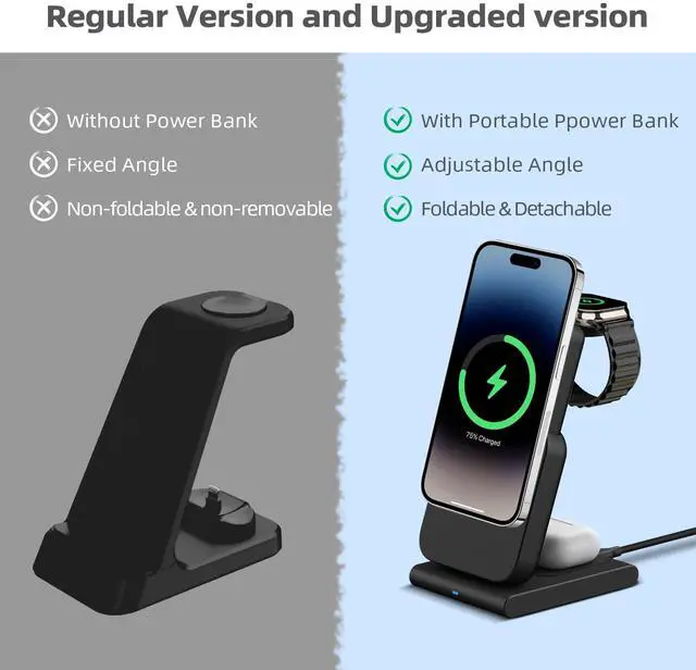 3-in-1 design: The wireless charger station provides three charging spots to charge the Phone, watch and earphones at the same time.