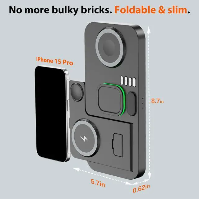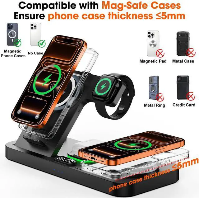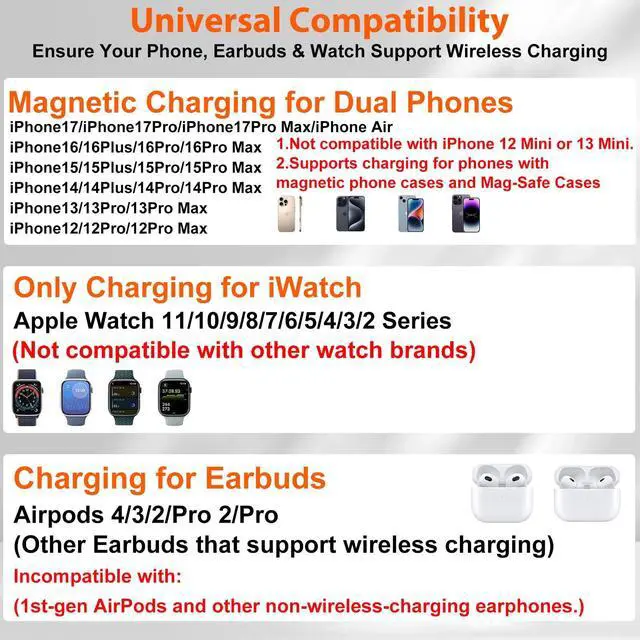 | Compatible Phone Models | [For Airpods]For Airpods 4, Airpods 3, AirPods Pro 3, AirPods Pro 2, AirPods Pro, AirPods (3rd generation), AirPods 2 Wireless Charging Case, Other Earbuds that support wireless charging. (Note: for AirPods, only work with wireless charging case, doesn't support with A3058, A2897, A1602 charging case),, [For iPhone Series]For iPhone 17, iPhone 17 Pro, iPhone 16e, iPhone 16 Pro Max, iPhone 16 Pro, iPhone 16, iPhone 16 plus, iPhone 15 Pro Max, iPhone 15 Pro, iPhone 15, iPhone 15 plus, iPhone 14 Pro Max, iPhone 14 Pro, iPhone 14, iPhone 14 plus, IPhone 13, iPhone 13 Pro, iPhone 13 Pro Max, iPhone 13 Pro Mini, iPhone iPhone 12 Pro, iPhone 12 Pro Max, iPhone 12, iPhone 11 Pro, iPhone 11 Pro Max, iPhone 11, iPhone SE (2nd generation), iPhone XS, iPhone XS Max, iPhone XR, iPhone X, iPhone 8, iPhone 8 Plus (Not compatible with iPhone 12 Mini or 13 Mini),, [For iwatch] For iWatch 11/10/9/8/7/6/5/4/3/2/1 [It is only compatible with Apple Watch, not with Samsung or other watch models.] |