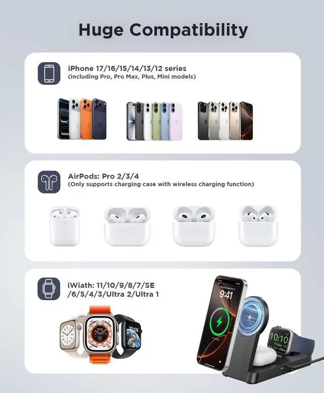 This magnetic wireless charger only supports charging for iPhone 12 - 16 Pro Max models. Cases that are thicker than 2.5mm or non-magnetic reduce charging efficiency, so their use is not recommended.