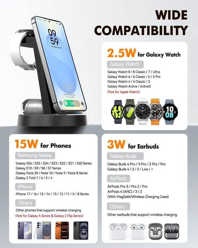 Universal Compatibility: This 3-in-1 wireless charging station supports Samsung Galaxy S26 Ultra / S26+ / S26 / S25 Ultra / S25+ / S25 / S24 Ultra / S24+ / S24 / S23 / S22 / S21 / S20 / S10 / S9 / S8 series; Galaxy Note 20 / 10 / 9 / 8 series; Galaxy Z Fold 6 / 5 / 4 series; iPhone 17 / 16 / 15 / 14 / 13 / 12 / Pro / Max / SE models, and other Qienabled phones, along with Galaxy Watch / Watch Classic / Watch Ultra / Watch Active models and Galaxy Buds / Buds+ / Pro / Live; AirPods / AirPods Pro earbuds. (Note: Not compatible with Galaxy Z Flip, Galaxy A series, or Apple Watch)