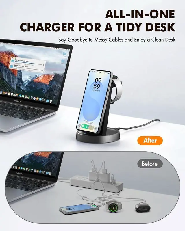 Built for Samsung Galaxy Power Users: Whether you're a content creator, business traveler, or student, this 3-in-1 station is designed for your ecosystem. It keeps your workspace efficient and cables hidden, simultaneously charging your multiple devices. The ideal three-in-one solution for on-the-go Samsung users