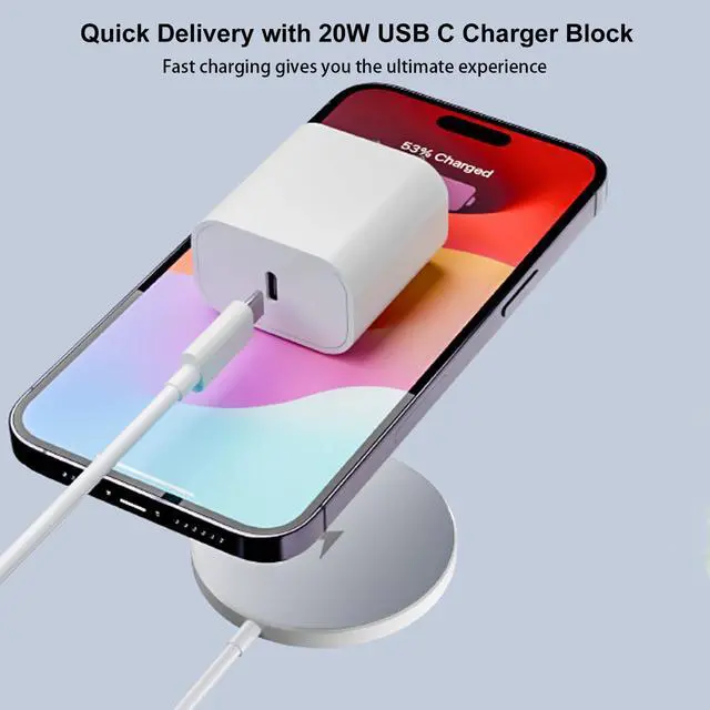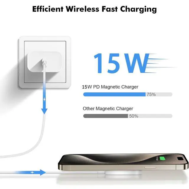 15W Portable Wireless Charger Our 15W iPhone Magnetic Charger Quick Charge Adapter for lightning fast charging. Charge your iPhone 15 to full capacity in just 2.5 hours, you can quickly power up your devices without any hassle. Fits perfectly on your workspace or nightstand with a smaller, thinner minimalist design! Keep your iPhone 16 15 Pro Max and AirPods Pro 2 charged at all times.