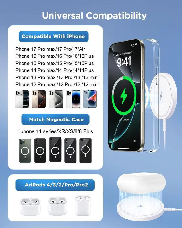 Wide Compatibility for Multiple iPhone ModelsDesigned to work seamlessly with a wide range of models, including iPhone 17, 17 Pro, 17 Pro Max, Air, 16, 16 Pro, 16 Pro Max, 16 Plus, 15, 15 Pro, 15 Pro Max, 15 Plus, 14, 14 Pro, 14 Pro Max, 14 Plus, 13, 13 Pro, 13 Pro Max, 13 mini, 12, 12 Pro, 12 Pro Max, 12 mini, 8 and above ( paired with magnetic case or ring), AirPods Pro4/Pro2/2/3/4 (Pro 2/3/4 requires wireless charging case) Not recommended for other brands. Not for iPad