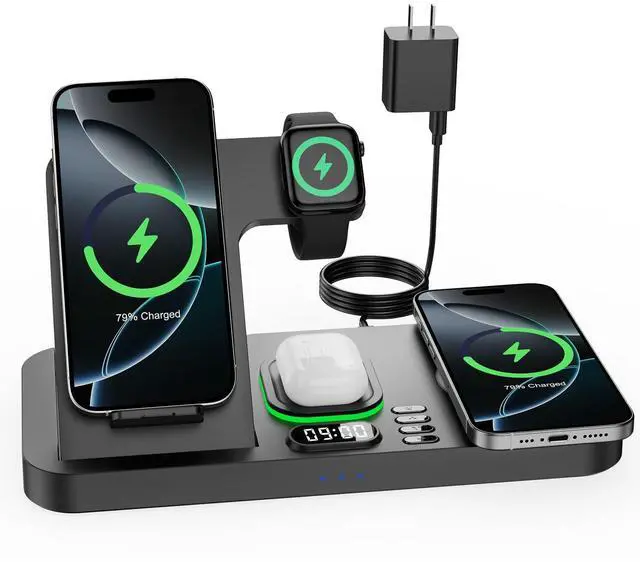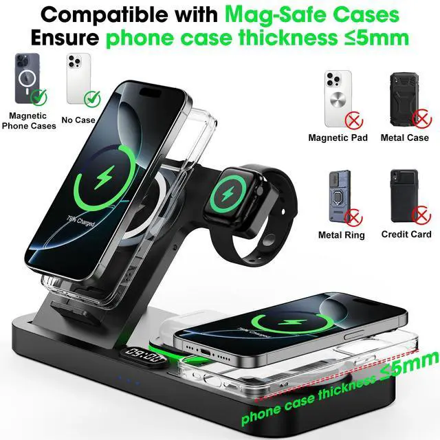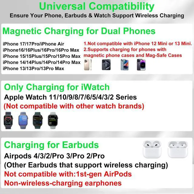 | Compatibility | Not compatible with iPhone 12 Mini or 13 Mini., Supports charging for phones with magnetic phone cases and Mag-Safe Cases, Not compatible with: 1st-gen Air-Pods and Non-wireless-charging earphones (Not for with A3058, A2897, A1602 charging case), Only Wireless Charging for apple watch, Not compatible with other watch brands, ?For iPhone Series?For iPhone 17, iPhone 17 Pro, iPhone 16e, iPhone 16 Pro Max, iPhone 16 Pro, iPhone 16, iPhone 16 plus, iPhone 15 Pro Max, iPhone 15 Pro, iPhone 15, iPhone 15 plus, iPhone 14 Pro Max, iPhone 14 Pro, iPhone 14, iPhone 14 plus, IPhone 13, iPhone 13 Pro, iPhone 13 Pro Max, iPhone 13 Pro Mini, iPhone iPhone 12 Pro, iPhone 12 Pro Max, iPhone 12, iPhone 11 Pro, iPhone 11 Pro Max, iPhone 11, iPhone SE (2nd generation), iPhone XS, iPhone XS Max, iPhone XR, iPhone X, iPhone 8, iPhone 8 Plus (Not compatible with iPhone 12 Mini or 13 Mini), ?For Airpods?For Airpods 4, Airpods 3, AirPods Pro 3, AirPods Pro 2, AirPods Pro, AirPods (3rd generation), AirPods 2 Wireless Charging Case, Other Earbuds that support wireless charging. (Note: for AirPods, only work with wireless charging case, doesn't support with A3058, A2897, A1602 charging case), ?For iwatch? For iWatch 11/10/9/8/7/6/5/4/3/2/1 [It is only compatible with Apple Watch, not with Samsung or other watch models.], Dual Magnetic Wireless Charging Station for Apple Devices (Phone, Earphones, Watch), Auto-Switching 7-Color Ambient Light, Switchable 12-Hour Format Clock, Package Includes: Adapter & Type-C Cable, Foldable / Portable / Universal Compatibility |