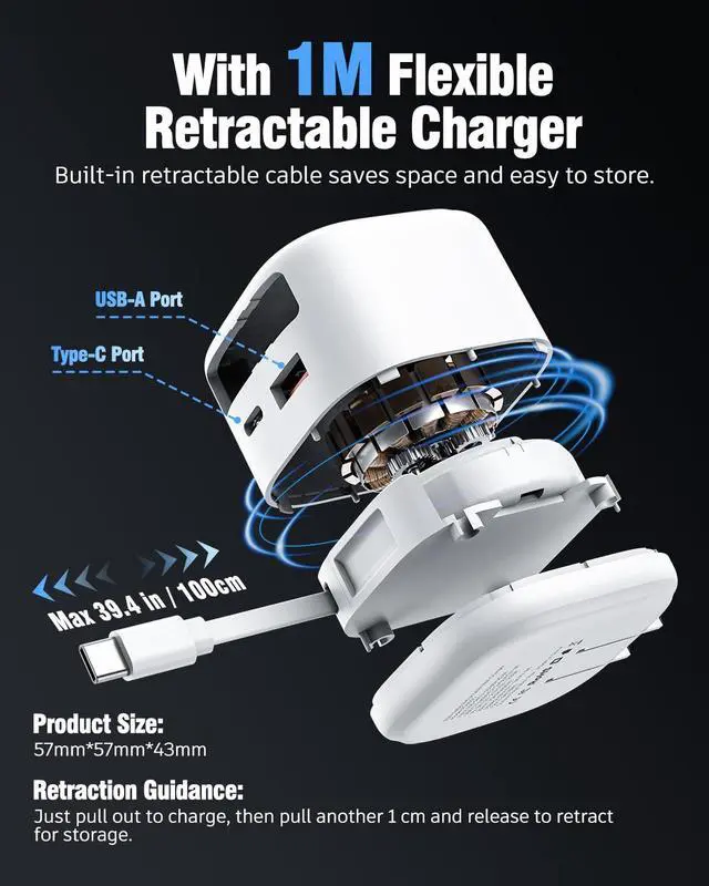 [Flexible Retractable Design] The retractable phone charger is equipped with a built-in cable, which can be easily extended up to 39.4" (100cm) and automatically retracted for storage. Perfect for use at home, in the office or on the go, it eliminates cable tangles and keeps your surroundings neat and organized