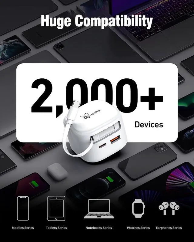[Travel Charger] DreamBee retractable phone charger wall plug with a foldable plug and retractable cable, offers enhanced travel convenience. Just fold the plug, retract the cable, and slip it into your bag or pocket while traveling. It shields your mobile phones and tablets from scratches and keeps your belongings organized