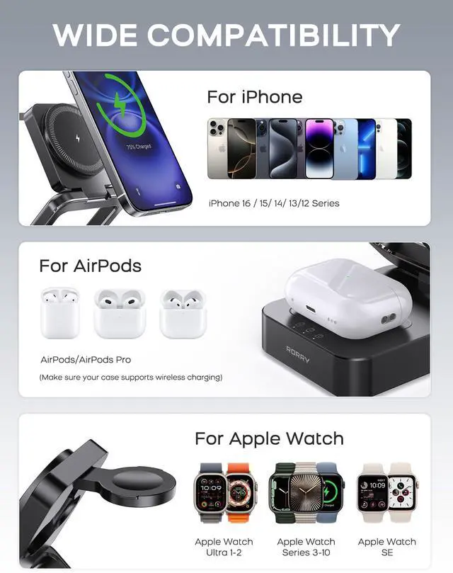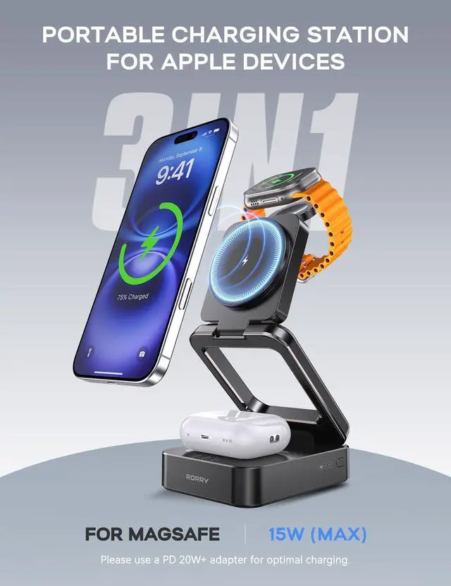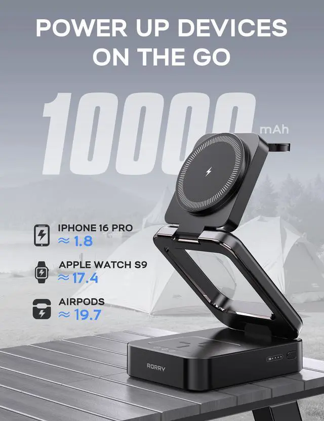 RORRY 3-in-1 for MagSafe Charger Station – Includes 10000mAh Foldable Power Bank