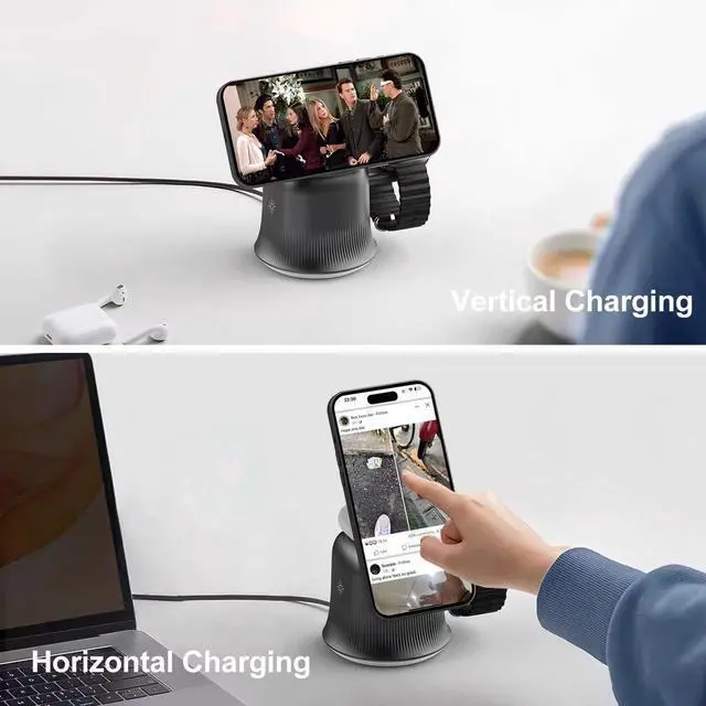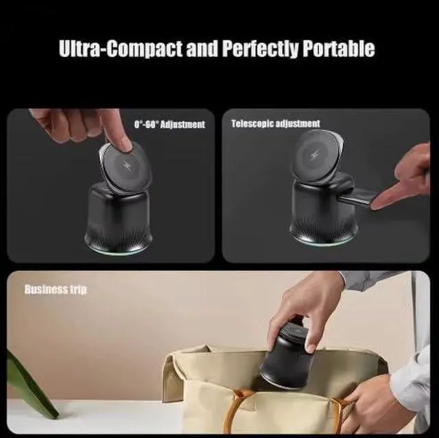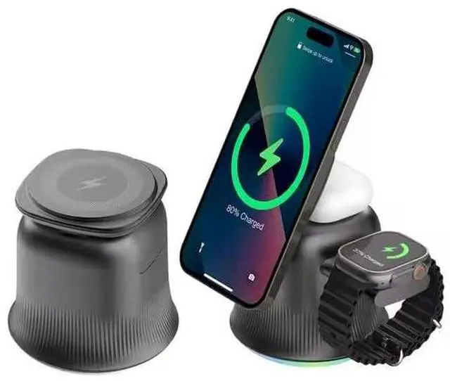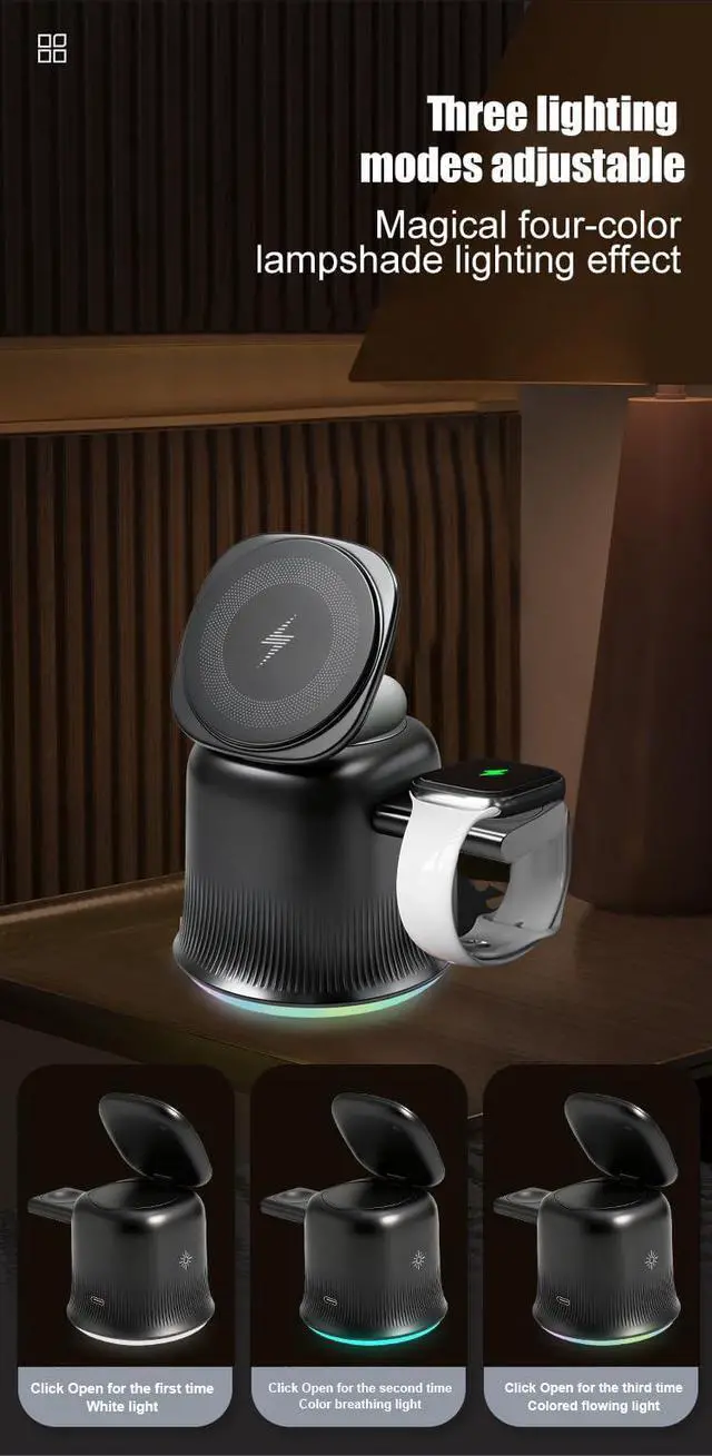 This innovative 3-in-1 wireless charging station is designed to power up your Apple devices with style and convenience. The adjustable magnetic charger accommodates your phone, watch, and other compatible devices simultaneously, eliminating cable clutter and keeping your desktop organized. What sets this charging station apart is its magical four-color lampshade lighting effect that creates an ambient atmosphere while you charge. Choose from three distinct lighting modes: white light for focused work sessions, color breathing light for a calming effect, or colored downward light for a vibrant glow. Simply click the device open to cycle through each mode and find the perfect ambiance for any time of day. The minimalist design features a sleek pedestal base with elegant ribbed detailing that complements any modern workspace. Available in classic black and white finishes, this high-end charging solution combines functionality with aesthetic appeal. The adjustable phone stand allows you to position your device at the perfect viewing angle, making it ideal for video calls or monitoring notifications while charging. Keep your essential devices powered and your space tidy with this well-organized, concise charging solution that's just right for the modern user.