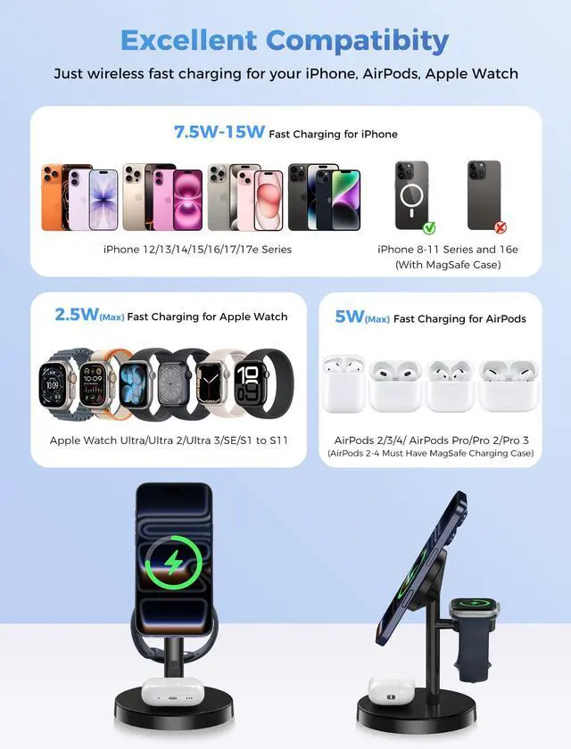 Powerful Magnetic Alignment - Built-in charging magnet is well compatible with MagSafe, making iphone and apple watch alignment easier and ensuring a secure connection so you never have to worry about dropping your phone. NOTE: Magnetic alignment works with iphone 12-17 series and latest model(iphone 8-11, 16e must have a magsafe-approved case) and apple watch. The thickness of case needs to be less than 0.02 inch/5 mm.