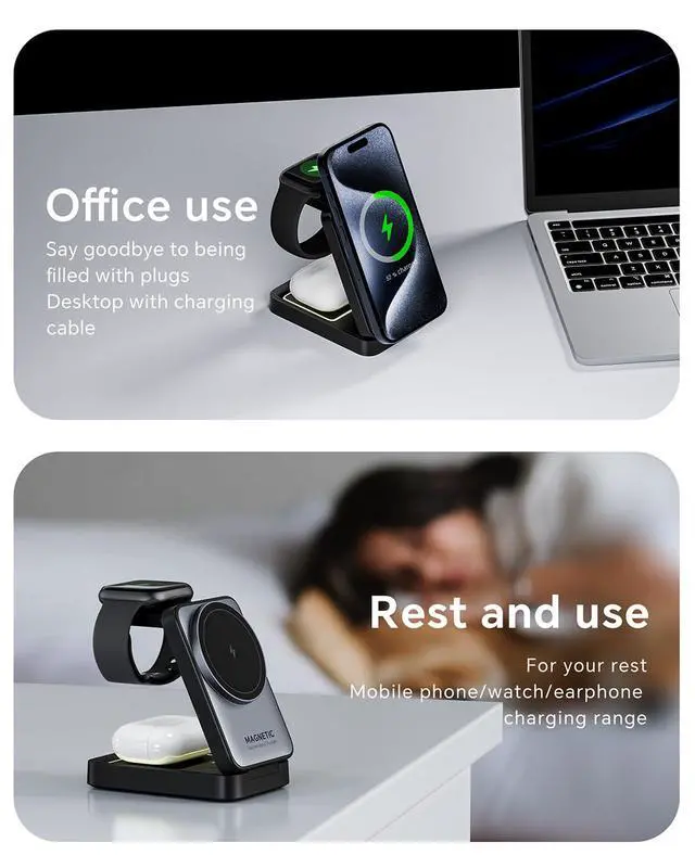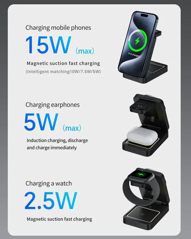 | What You Get: | 1 x 3 in 1 Foldable Wireless Charger, 1 x 5ft Charging Cable, 1 x User Guide |