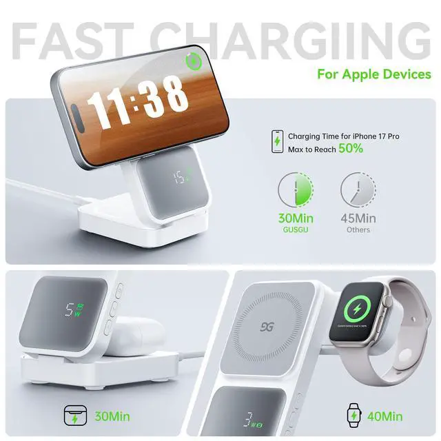 Experience seamless integration with the charger ecosystem and beyond with our 3-in-1 wireless charging station. This sleek and stylish charger, featuring a refined ABS+PC plastic and metal paint exterior, supports simultaneous charging for your phone, earbuds, and smartwatch. The built-in time display and real-time power indicator keep you organized and informed. Designed for convenience, the modern aluminum alloy display panel ensures your devices align perfectly with just a simple placement. Ideal for travel, this portable and foldable charger is lightweight and compact, making it the perfect companion for home, office, or on-the-go. With our QC3.0 fast charging adapter and a maximum power output of 20W, you can quickly charge up to three devices at once. Safety is paramount, as our charger includes fill-and-stop technology and real-time temperature monitoring to ensure efficient and safe charging. The package comes with the wireless charger, a free 30W adapter, and a charging cable. For any issues or questions, feel free to reach out to us.