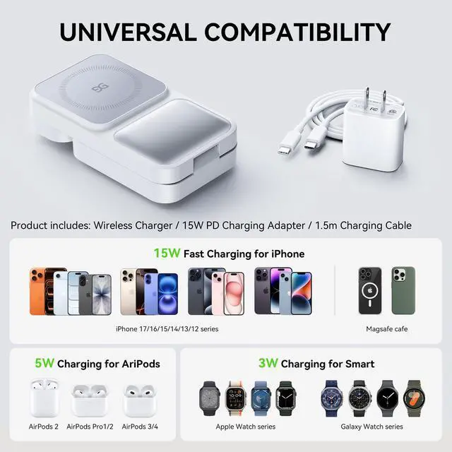 | Compatible Phone Models | iPhone Series:iPhone 17, iPhone 17 Pro, iPhone 17 Pro Max, iPhone Air, iPhone 16, iPhone16 Pro, iPhone 16 Pro Max, iPhone 15 Pro Max, iPhone 15 Pro, iPhone 15, iPhone 15 plus,iPhone 14 Pro Max, iPhone 14 Pro, iPhone 14, iPhone 14 plus, IPhone 13, iPhone 13 Pro, iPhone 13 Pro Max, iPhone 13 Pro Mini, iPhone iPhone 12 Pro, iPhone 12 Pro Max, iPhone 12, iPhone 12 mini Airpods: AirPods Pro 3, Airpods 3, AirPods Pro 2, AirPods Pro, AirPods (3rd generation), AirPods 2 Wireless Charging Case; Apple watch: Apple Watch Series 1-11, Apple Watch Ultra 3, Apple Watch SE 3 |