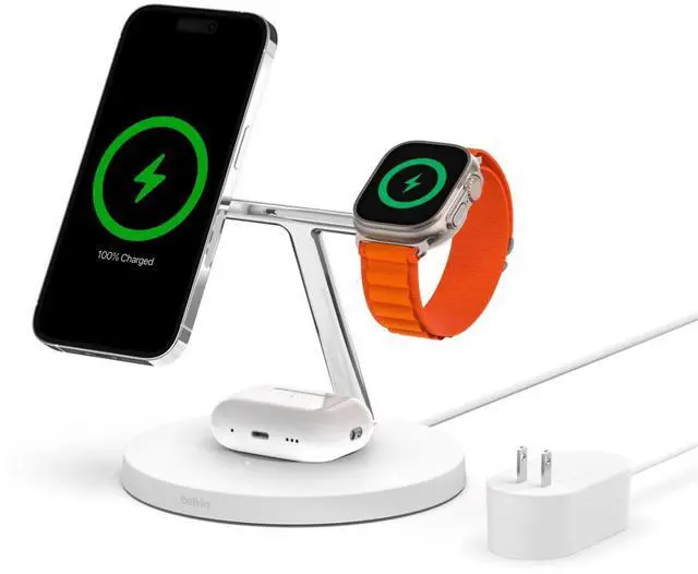 What devices are compatible with this Belkin 3-in-1 Wireless Charging Stand?