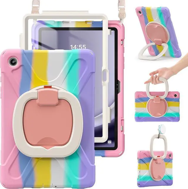 Case for Sam-sung Galaxy Tab A9 Plus/ A9+ 11\u201d 2023 (SM-X210/X216/X218), Heavy Duty Rugged Cover with Screen Protector, 360 Degree Rotating Stand, Stable Kickstand, Shoulder Strap, Colorful Pink