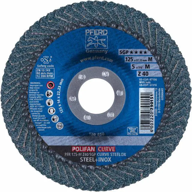 Flap Disc, Abrasive Type Coated, Abrasive Material Zirconia Alumina, Grade Coarse, Backing Plate Material Fiberglass, Connector Size 7/8 in, Connector Type Unthreaded Hole, Density Rating Standard, Flap Disc Type Radial, Overall Diameter 5 in, Series Z SGP CURVE, Backing Material Fiberglass, Backing Weight Consumable, Grit 40, Maximum Operating Speed 12, 200 RPM. This item has been restricted from sale in the following state (s): []