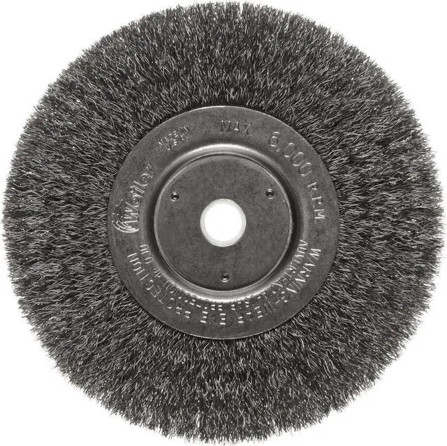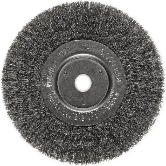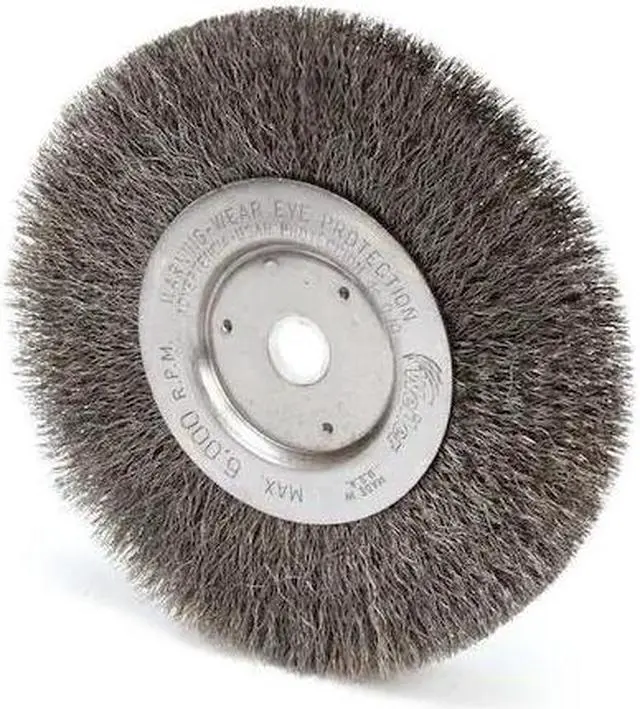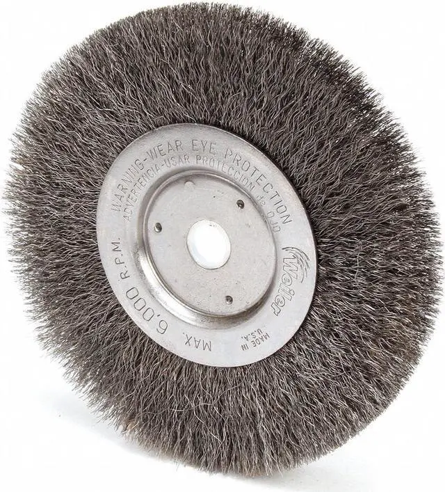 Flexible brushing action. Can be mounted in multiples. Type: Crimped-Wire Wheel; Wheel Diameter: 6"; Speed: 6,000 rpm; Material(s): Steel.