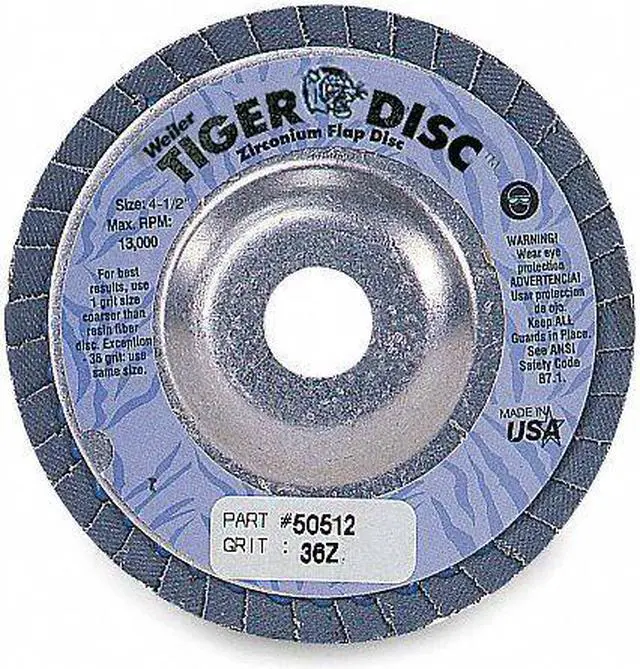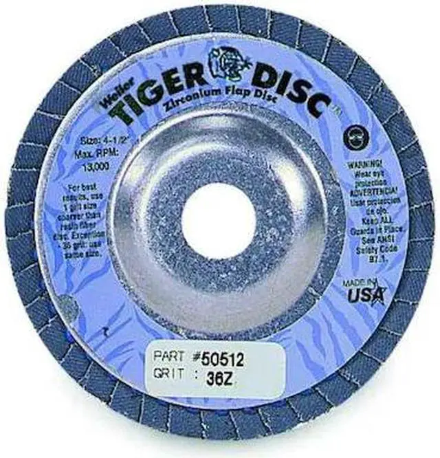 California Proposition 65: This product contains a chemical known to the State of California to cause cancer. Flap Disc, Type 29, Disc Diameter 4 1/2 in, Mounting Hole Size 7/8 in, Abrasive Grit 36, Abrasive Grade Extra Coarse, Abrasive Material Zirconia Alumina, Series Tiger (R), Max. RPM 13, 000 RPM