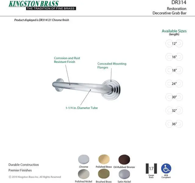 California Proposition 65: This product contains a chemical known to the State of California to cause birth defects or other reproductive harm. Kingston Brass grab bars are beautifully designed to offer not only an aid in preventing falls, but unique style. Useful for all ages, these can be located in showers, near toilets, or in any customized location. This particular grab bar resourcefully provides support as it enhances a traditional style.