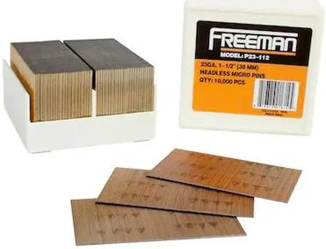 California Proposition 65: This product contains a chemical known to the State of California to cause birth defects or other reproductive harm. Freeman P23-112 23-Gauge 1-1/2" Glue Collated Headless Micro Pins (10, 000 count) are designed for applications such as detailed trim, moulding, glazing strips, cabintry, muntin bars, jewelry cases, picture frame assembly, as well as hobbies and crafts. These micro pins are barely noticeable in finish projects due to their headless design, and bond small work pieces without splintering. They are the pinnacle of quality and value, and are compatible with most 23 gauge micro pin nailers capable of firing 1-1/2" glue collated headless pin nails - such as Freeman's PP223. Each box includes 10, 000 headless micro pin nails to ensure you have plenty of fasteners at your fingertips while on the job.