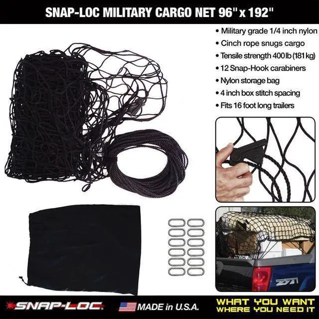 This 96 x 192 inch made in USA Military grade Cargo Net with cinch rope conveniently holds down cargo and junk on trucks and trailers! Extra long rope edge with cinch buckle can expand past the perimeter of the net to reach tie down clips at different distances. Net is made from military grade .25 inch thick heavy duty long lasting nylon with 4 x 4 inch sized squares. Includes storage bag and 12 Snap-Hook Carabiners for fastening to optional Snap-Loc accessories and other types of anchor rings. Because number of fastening clips and cargo type will vary- net is rated at a tensile strength of 400 pounds (181 kg). Some use this net for lifting cargo- but net is not recommended for lifting. Snap-Loc Military Cargo Nets give you -Ultimate Cargo Control- and are made in the USA! Snap-Loc parts also fit with other industry standard E-track accessories. Try -Snap-Locs E-Track Singles- the -Fastest- Safest and Easiest- way to strap stuff -Where You Need It- on pickups- trucks- trailers- racks- walls- ceilings- floors and more! Only -The Snap-Loc System- provides a permanent comprehensive solution for all your cargo management needs with a coordinating variety of Straps- Accessories- Dollies- Carts and more.