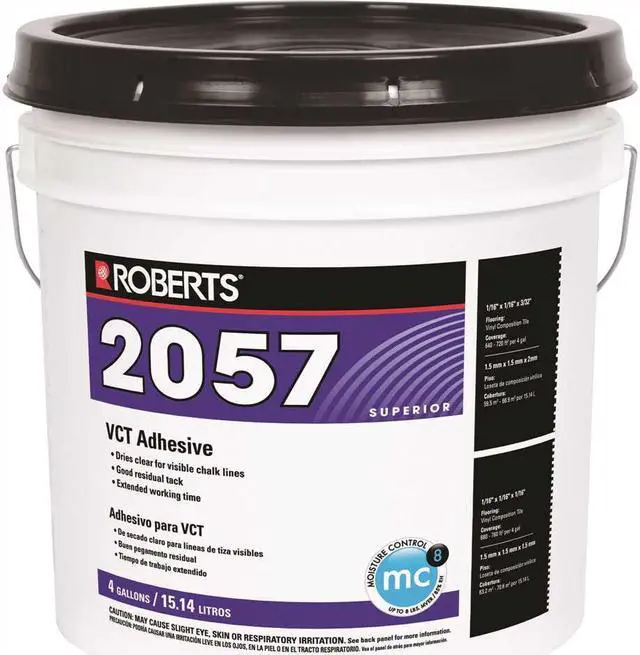 ROBERTS 2057 Vinyl Composition Tile (VCT) Adhesive is a clear, solvent-free, water-based, thin-spread adhesive that provides excellent grab and high residual tack. This superior grade adhesive brushes, rolls or trowels on and helps hold tiles firmly in place, even when subjected to repeated cleaning and mopping. When spread thinly as instructed, the adhesive dries correctly and turns clear, allowing chalk lines to remain visible. This adhesive is also suitable for installing vinyl-composition or vinyl-asphalt tile over existing vinyl-composition or vinyl-asphalt subfloors that are free from waxes, sealers and finishes.