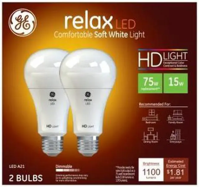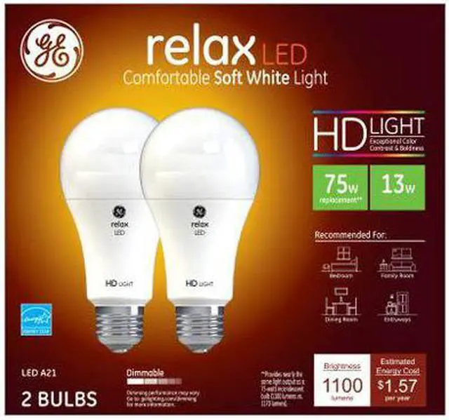 GE, 2 Pack, LED13DASW9-2PK, 13W, Soft White Light Color, White Bulb Color, A19 Shape, Relax High Definition, HD LED Light Bulb, Equivalent To A 75W Incandescent, Medium Base, Dimmable, 1, 100 Lumens, 2, 700 Kelvin Color Temperature, CRI = 90, 13 Year, 15, 000 Hours Rated Life, MOL = 4.43", Boxed.
