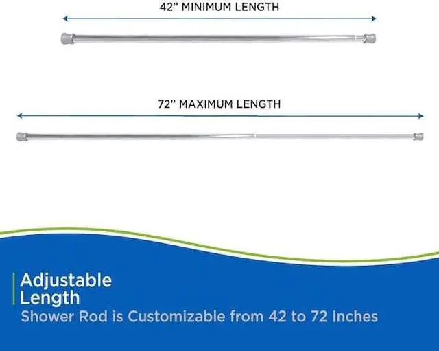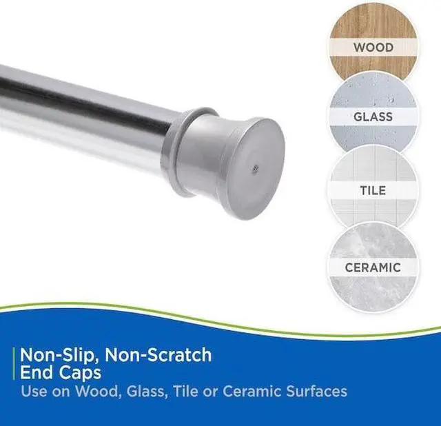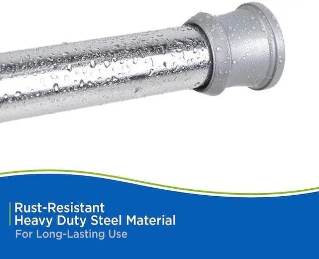 Update the look of your bathroom with the Twist & Fit Tension Shower Rod by Kenney. This rod features sturdy steel construction and non-slip, non-scratch PVC finials. Easy to install, with no tools required. Simply slide the adjustable rod to fit inside your shower space and twist the rod to lock in place. The rod is plated steel rod with a chrome finish. The unique finial design has a ring lock feature keeping your shower hook or ring located closest to the wall in place when traversing your shower curtain or liner.