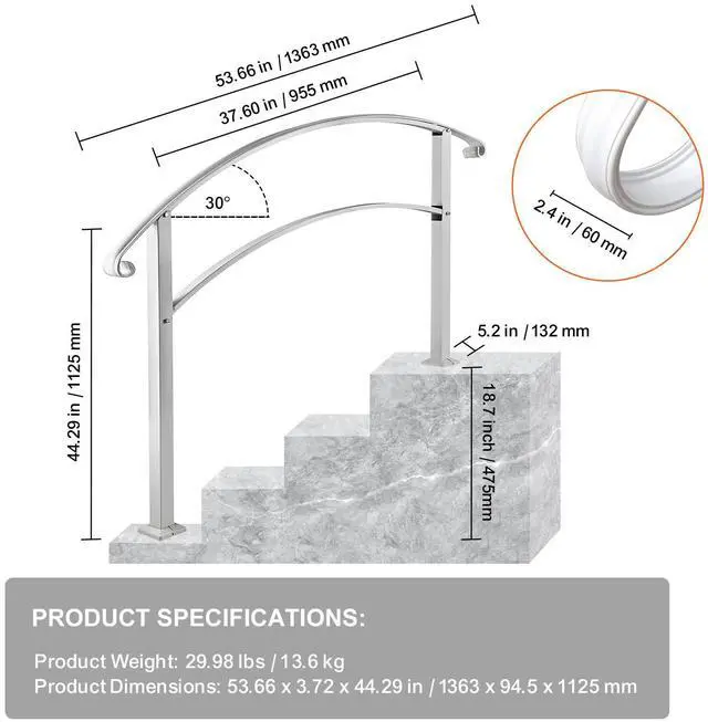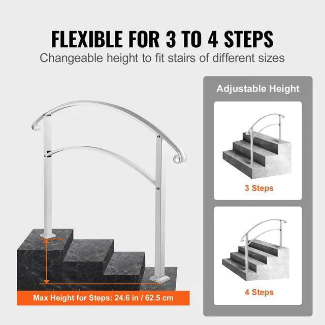 Flexible for 4 Steps: Max Height for Steps: 18.7"/47.5 cm; Distance Between Posts: 37.6"/95.5 cm; Upper Post Height: 38.2"/97 cm; Lower Post Height: 41.7"/106 cm. Due to the flexible height, our wrought iron handrail fits your 4 steps according to the different sizes. It is perfect for helping people keep balance in the rain or winter and prevent skidding.