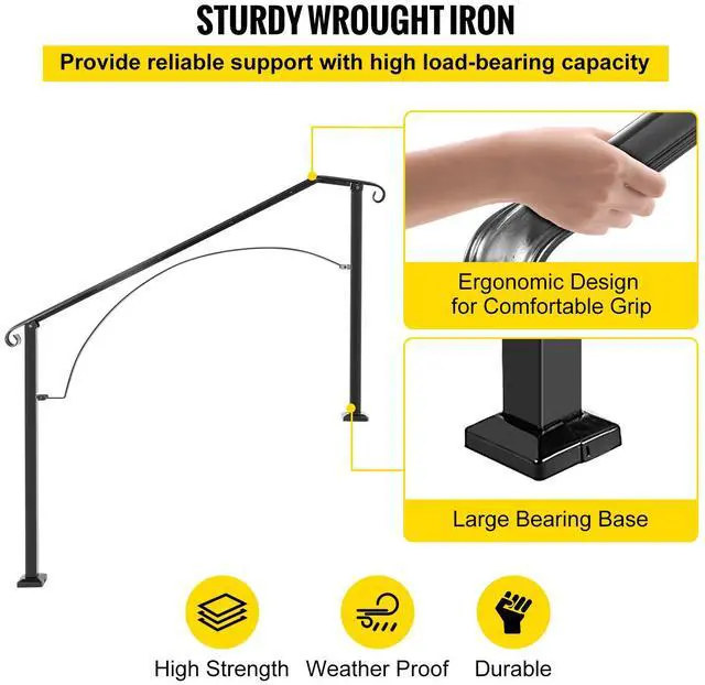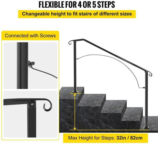 Handrails for Outdoor Steps, Fit 4 or 5 Steps Outdoor Stair Railing, Arch#4 Wrought Iron Handrail, Flexible Porch Railing, Black Transitional Handrails for Concrete Steps or Wooden Stairs