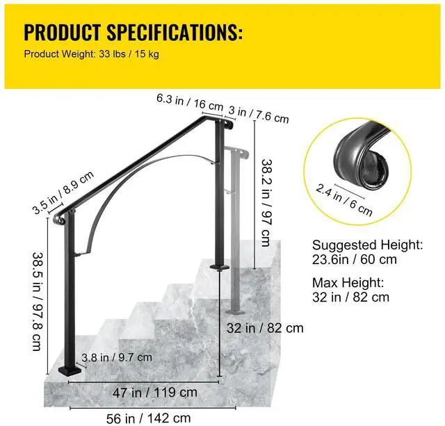 Model: Arch#4 Material: Wrought Iron Steps: 4 or 5 Max Height for Steps: 32"/82 cm Distance Between Posts: 56"/142 cm Upper Post Height: 38.2" /97 cm Lower Post Height: 38.5" / 97.8 cm Color: Black Product Weight: 33 lbs/15 kg