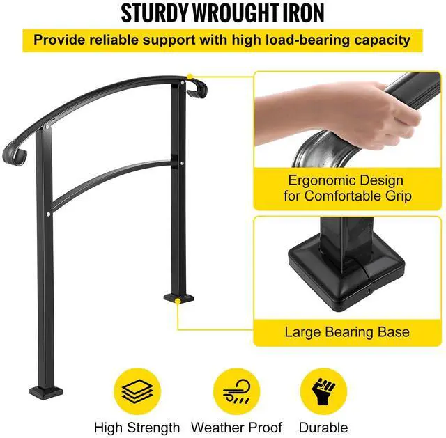 3-Step Transitional Handrail Fits 1 or 3 Steps Matte Stair Rail Wrought Iron Handrail with Installation Kit Hand Rails for Outdoor Steps (Unadjustable) (Black)