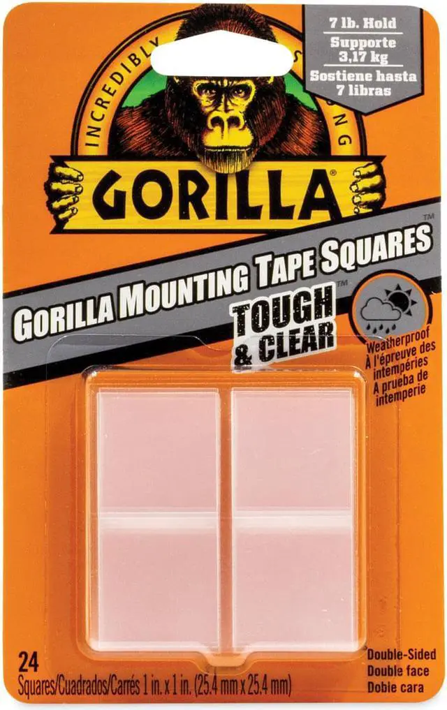 Gorilla tough & clear mounting tape squares are clear, double-sided, 1 inch squares of tape that mount in an instant for a permanent, weatherproof bond. These crystal clear squares won't yellow over time, and hold up to 7 pounds! Gorilla tough & clear mounting tape squares are perfect for indoor and outdoor projects and stick to smooth and Rough surfaces. Completing DIY projects is easy with these pre-cut, double-sided squares. Mount, build and repair! bonds: plastic, metal, wood, glass, brick, ceramic, stone, drywall & more.