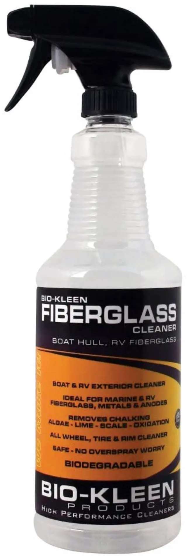 Bio-Kleen Fiberglass Cleaner is a boat, RV, camper and trailer exterior cleaner. Designed to dissolve and remove rust, scale, lime, corrosion, soap scum, chalking, yellow stains from a fiberglass RV and most water minerals from fiberglass and acid resistant surfaces including: raw metals, porcelain, tile and grout. Rapid action quickly penetrates mineral buildup and dissolves in minutes. Leaves surface sparkling clean. Use on boat hull, drives, props, pontoons, trailers, fiberglass RV exterior, campers, tires, wheels, rims, metals, sinks, bathtubs, shower stalls, toilet seats and bowls, stainless steel fixtures, swimming pools, ceramic tiles and grout.