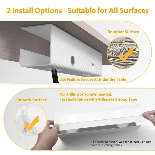 Each ZhiYo Cord Tray comes with 1 roll of adhesive tape, and 9 screws and anchors, suitable for all surfaces (smooth or rough). With 4 pre-drilled mounting holes, nail installation is also straightforward.