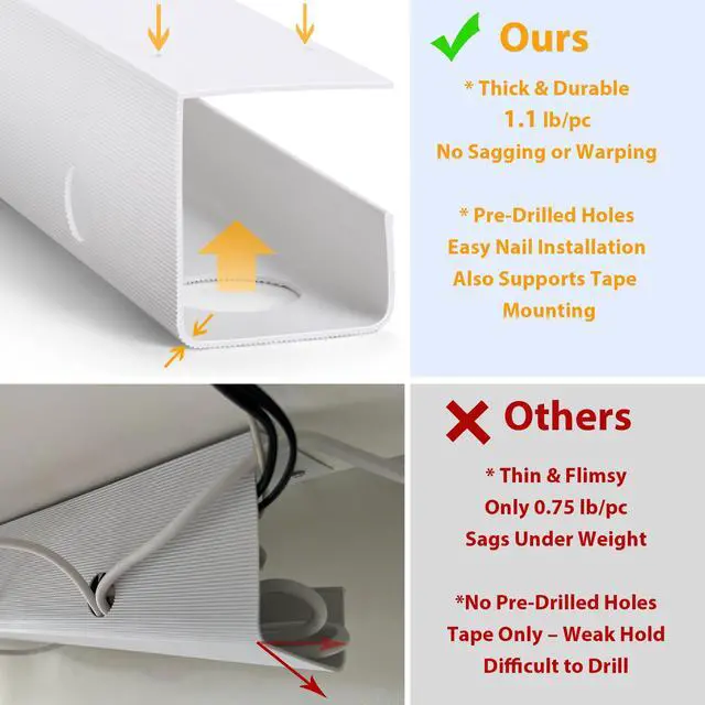 Made from quality solid PVC and upgraded to a thickness of 2.5mm. The package includes 2 desk cable trays, 4 cable clips, and 5 reusable cable ties for added value