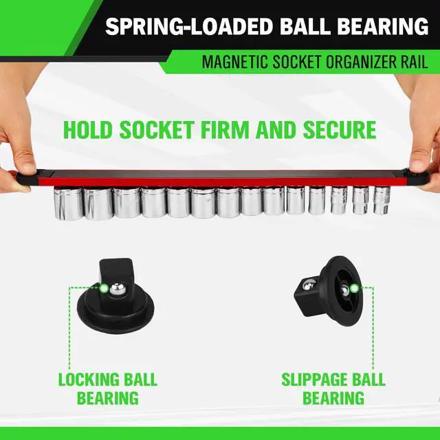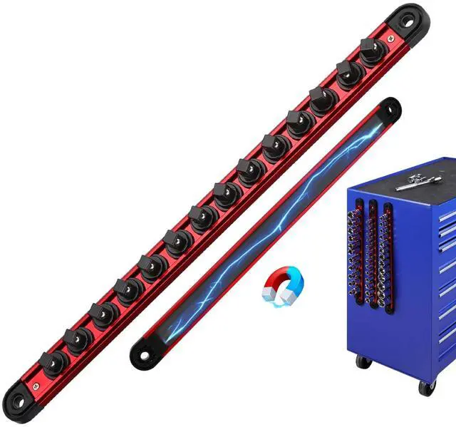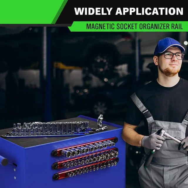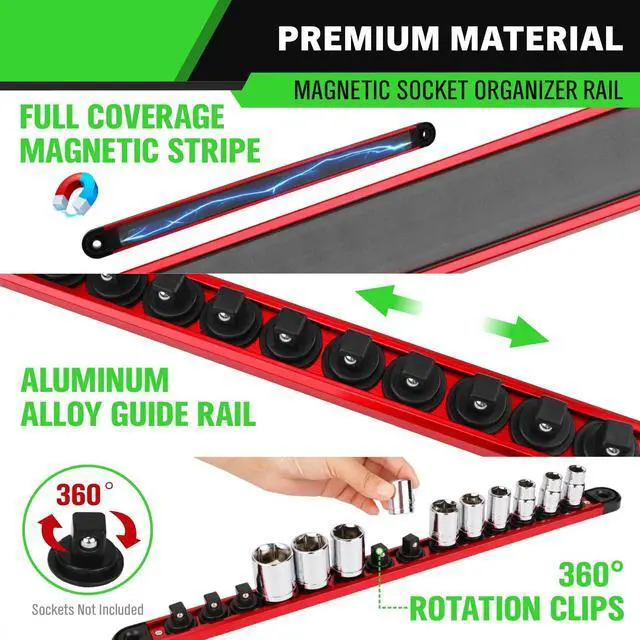 3/8-Inch Professional Magnetic Socket Organizer Revolutionize your tool storage with this heavy-duty aluminum rail featuring 14 swivel clips and powerful magnetic base! The premium alloy construction withstands shop abuse while 360° rotating clips provide instant socket access. Spring-loaded steel beads securely retain sockets even upside down, and the 16.1" rail fits most toolbox drawers. Mount vertically via hanging holes or stick to any steel surface perfect for mechanics, electricians, and DIYers seeking clutter-free workspaces.