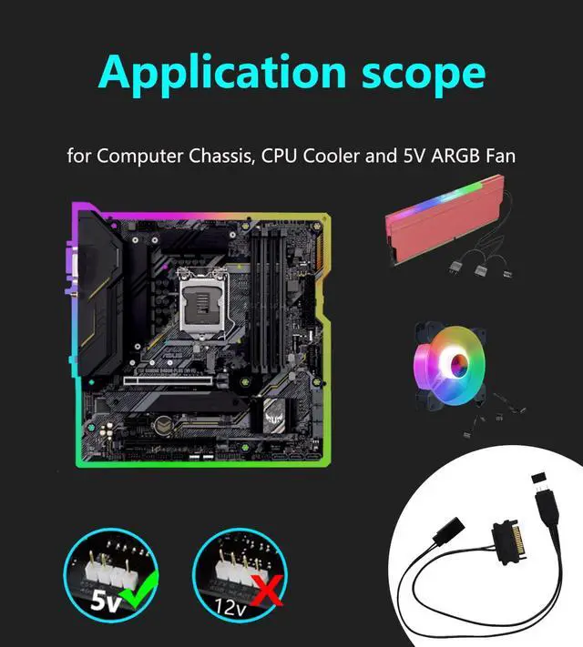 Applicable equipment:5V ARGB equipment,such as chassis fans,lamps,light panels,air-cooled radiators,water-cooled radiators,motherboards without 5V ARGB,or DIYA RGB fans,ARGB light strips,lighting boards,etc