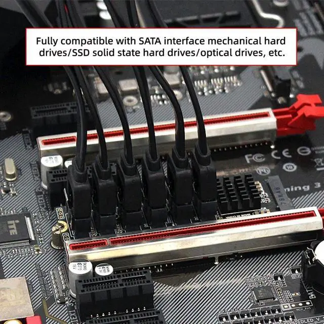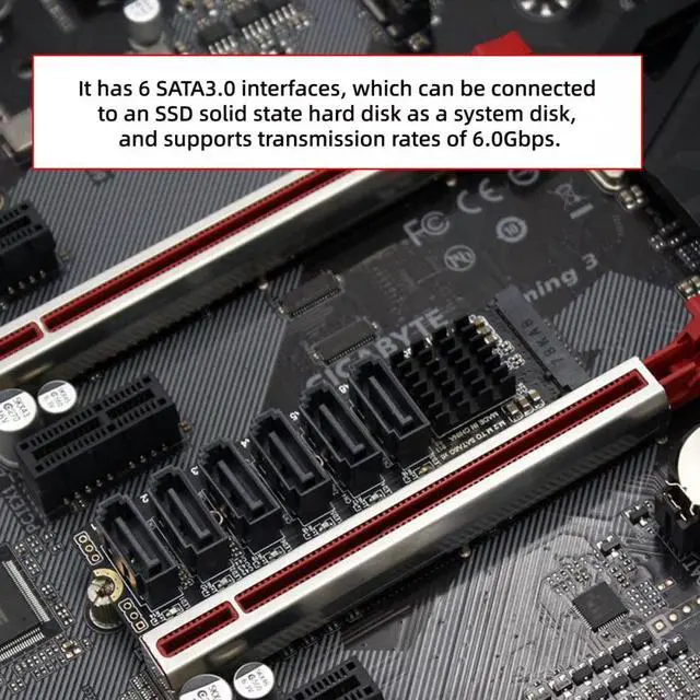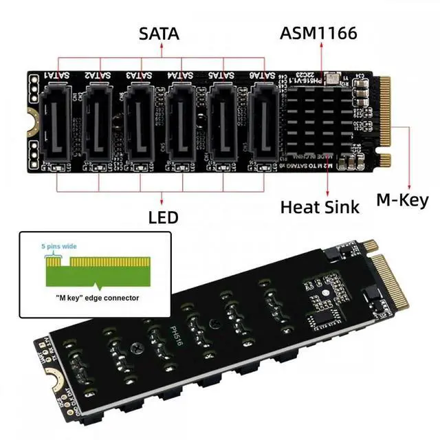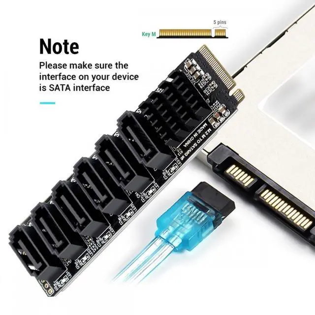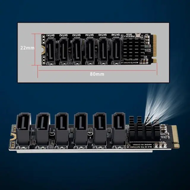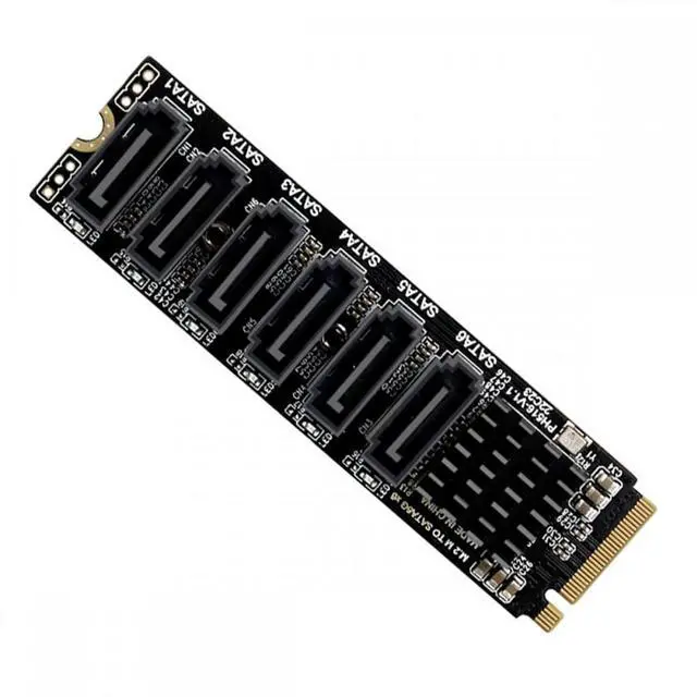 NVMe M-Key to 6 SATA Adapter is designed for less SATA Ports but more spare M.2 NVMe Slots on Motherboard, This M.2 SATA Adapter will help you expand 6x regular SATA ports for storage appliances that use many SSDs and/or 3.5" hard drives.