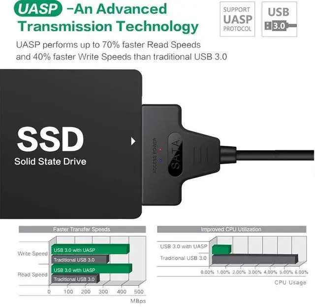 The sata to usb 3.0 adapter cable has a data transfer speed of 6Gbit/s which is equivalent to 600 MB/s. It also supports USB 2.0/1.1, External Converter for SSD/HDD Data Transfer
