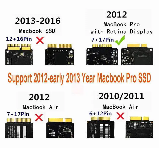 Only Fit the following SSD models from 2012-early 2013 Year MACBOOK PRO A1425 A1398 MC975 MC976 MC212 MD213: SSD: Samsung MZ-DPC5120/0A2, San-disk SD5SL2-512G-1205E,Samsung MZ-DPC128T/0A2,MZ-DPC2560/0A2 NOTICE: Pls make sure USB 3.0 port of your computer can provide at least 2A current. Because if power not enough, SSD cannot be recognized or slow transfer. ( Retina SSD needs 3.3V - 2.39A, it clearly marked " 3.3V - 2.39A" on SSD Surface.) Indication of LED light: On, no blink - SSD is recognized On, blink - Data transfer Off - no power supply OR SSD is not recognized