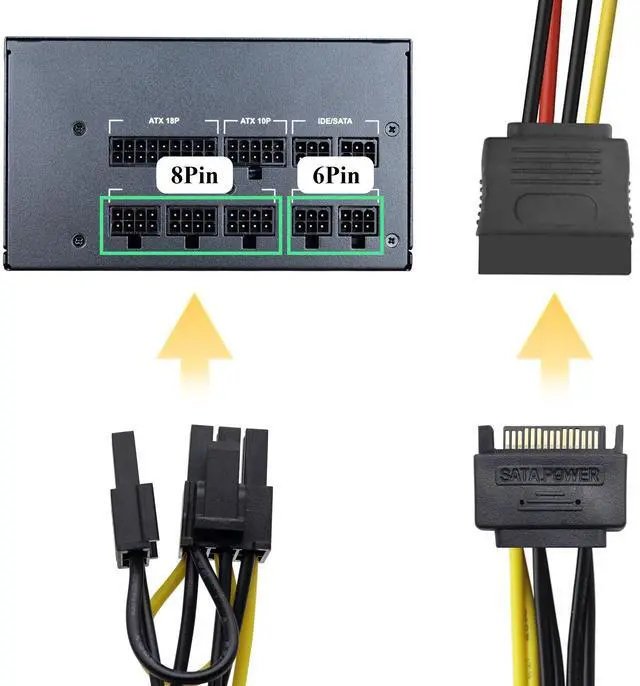 Warning: The maximum power of SATA plug:12V × 4.5A = 54W. Please note that the power consumption of the 8-pin (6+2) socket exceeds the SATA power supply limit. If the power of SATA plug is exceeded, there may be a risk of burning out or catching fire.