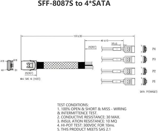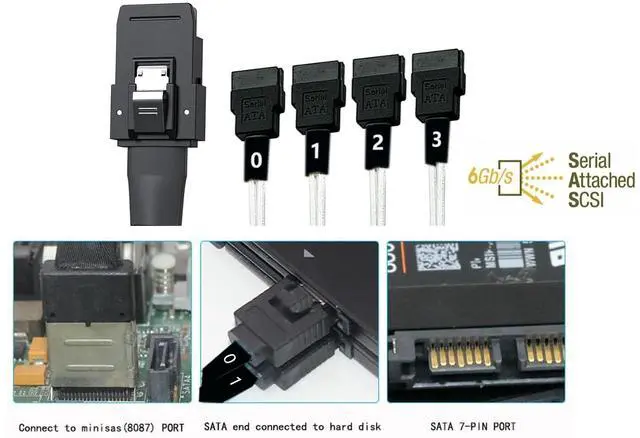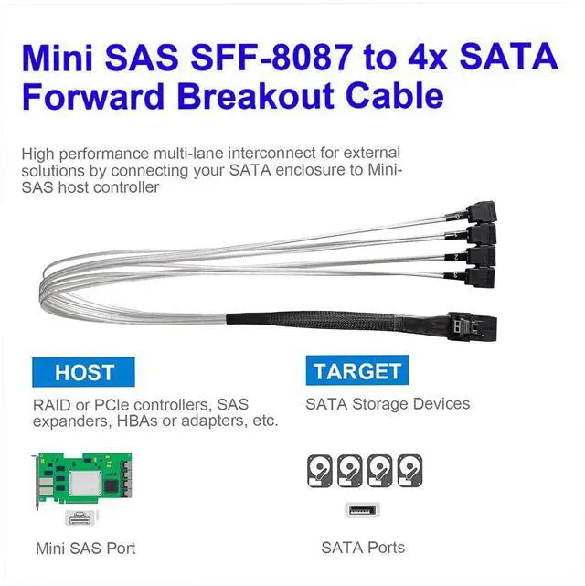 Vszerda mSAS Cable SFF-8087 to 4 SATA for SAS/RAID Controllers, HDD, Backplanes and Server, 40 in.