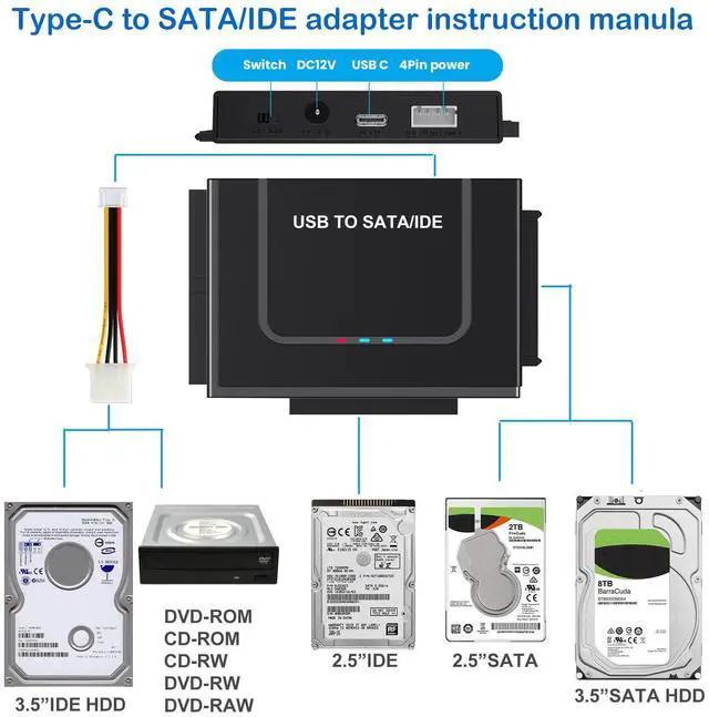 IDE and SATA In One: This SATA USB adapterhas 3 ports that accommodate 40 Pin 2.5 inches IDE, 44 Pin 3.5 inches IDE, and 2.5/3.5 inches SATA