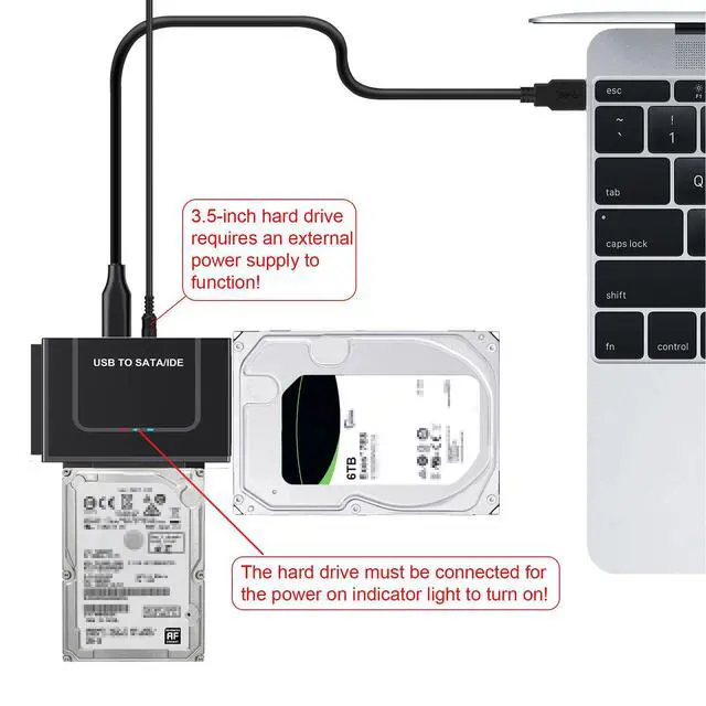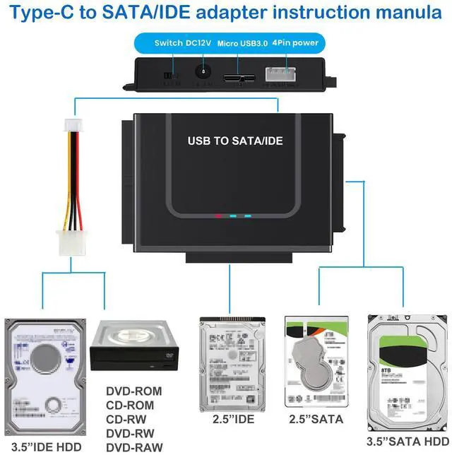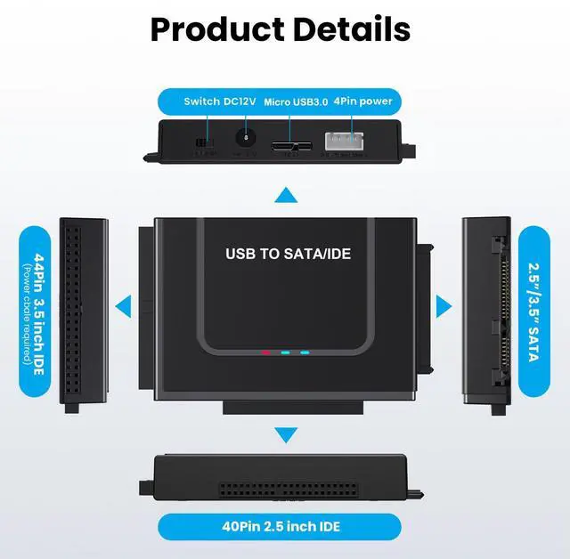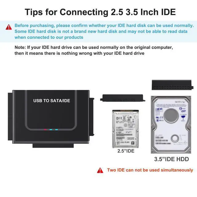 IDE and SATA In One: This SATA USB adapterhas 3 ports that accommodate 40 Pin 2.5 inches IDE, 44 Pin 3.5 inches IDE, and 2.5/3.5 inches SATA