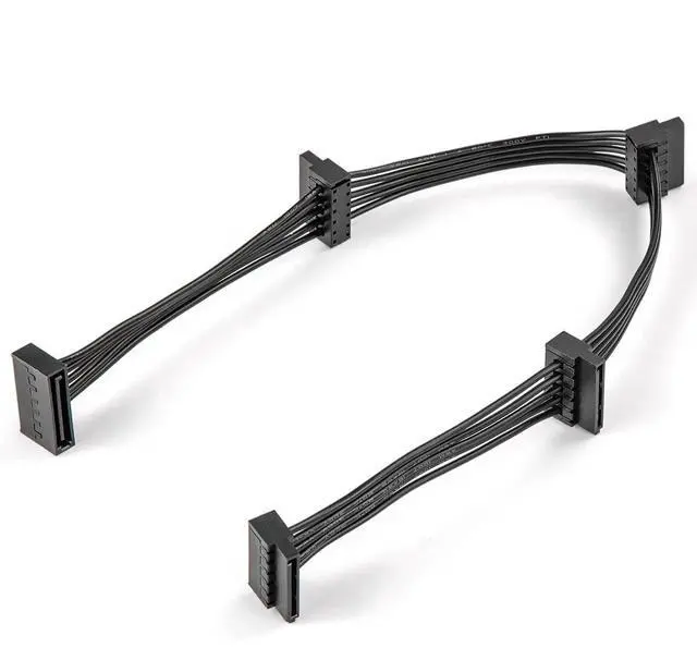 15Pin SATA Splitter 1 to 4, 1x SATA Male to 4x SATA Female Receptacles Splitter; the SATA splitter cable powers up to four Serial ATA HDD, SSD, optical drives, DVD burners, and PCI-E cards from a single connection to computer power supplies; Snug-fitting drive SATA power cable clicks into place on your power supply to provide a secure connection that prevents accidental disconnection