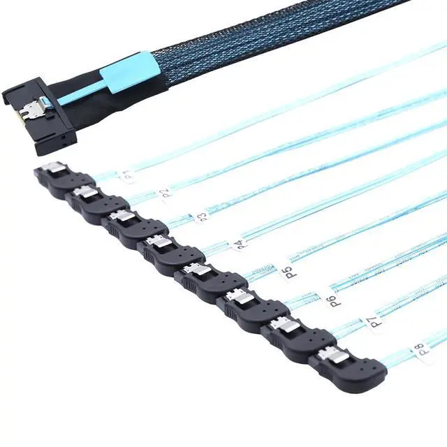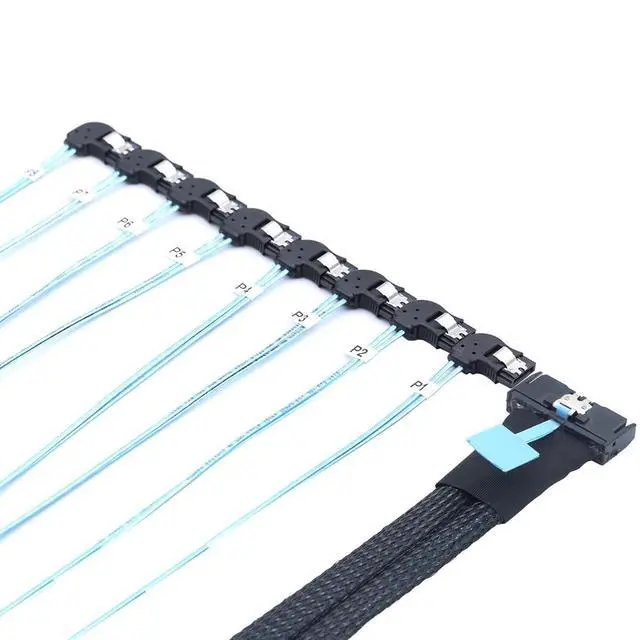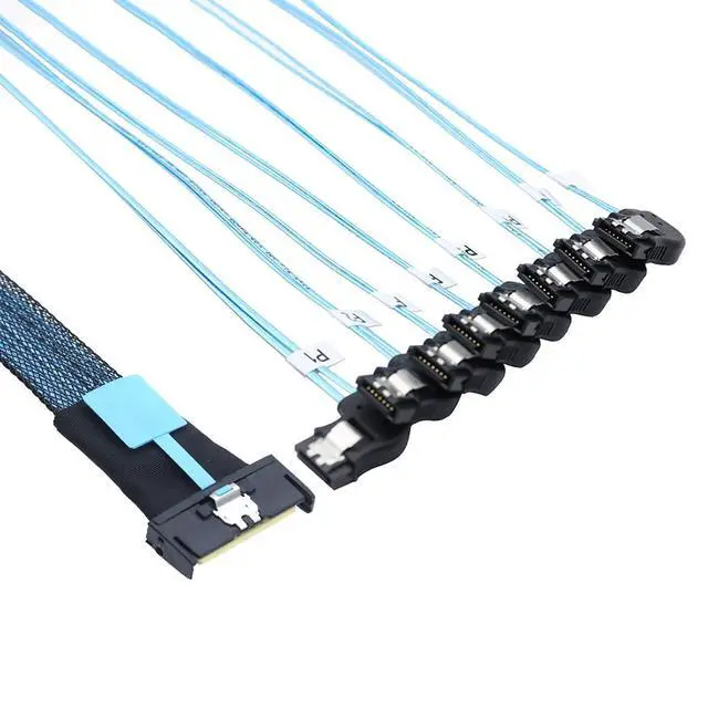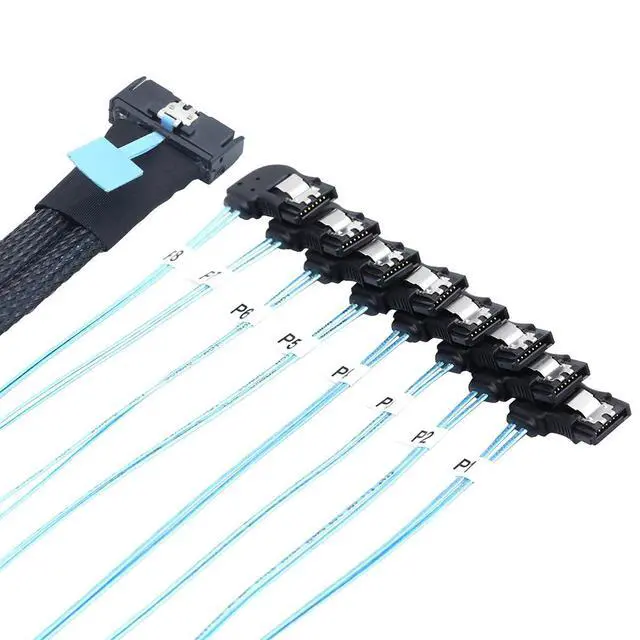 High-Speed Data Transmission \u2013 MCIO PCIe Slimline SFF-8654 8i to 8x SATA 7P breakout cable designed for servers, supporting stable high-bandwidth connections for enterprise storage systems.