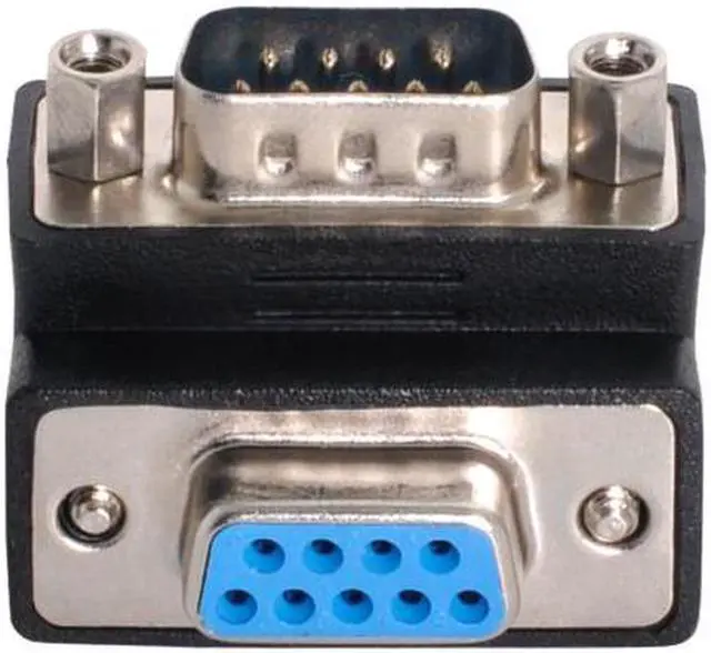DB9PIN Socket to DB9PIN Plug DOWN Right Angled Adapter the Female is thumbscrew type the Male is screw nuts A right-angled 9 pin DSUB plug to socket adaptor