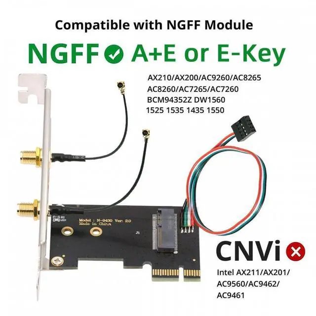 Wireless NGFF A/E-Key WiFi Card to PCI-E Express 1x Adapter for WLAN Wifi6 Wifi7 Bluetooth, Convert the PCI-E interface of the motherboard to M. 2 KEY A-E or KEY E interface. Supports PCI-E 1X 4X 8X 16X connector. No additional power required. Small body and stable performance.